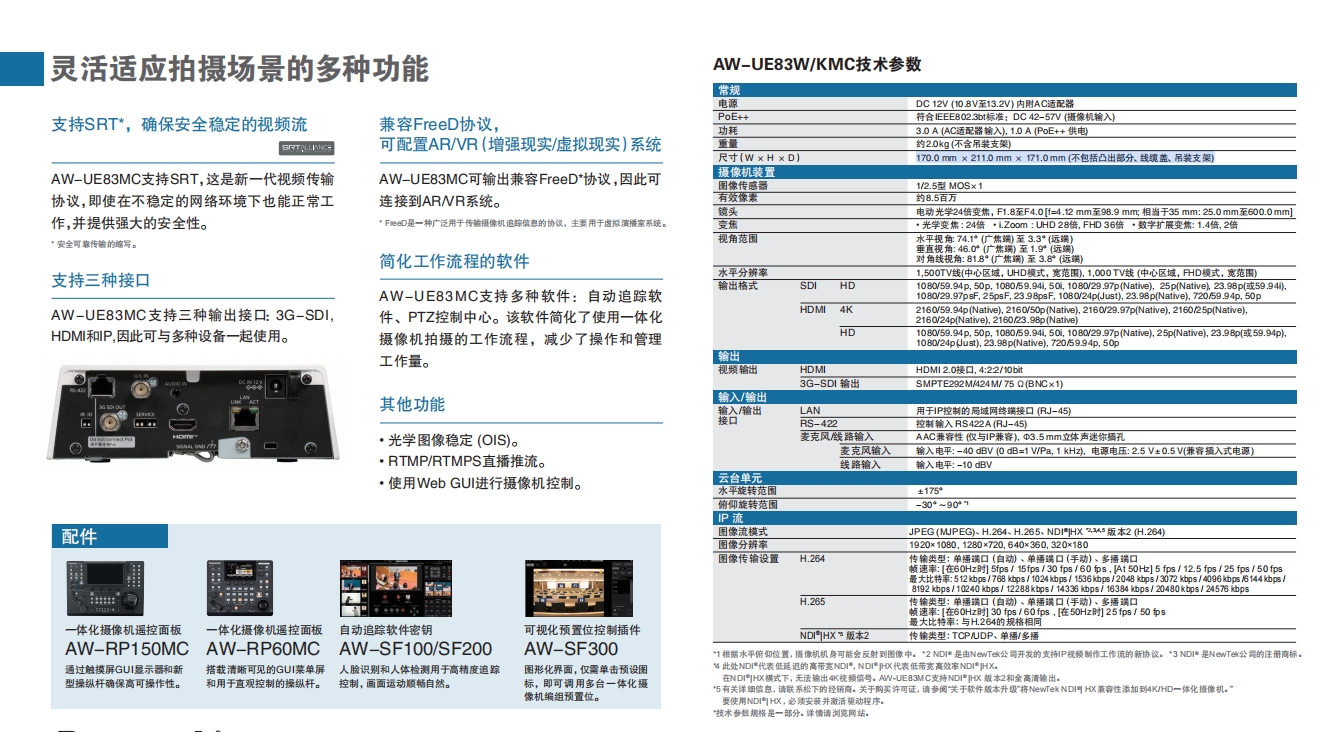 AW-UE83W/KMC支持SRT,這是新一代視頻傳輸協議,即使在不穩定的網絡環境下也能正常工作,并提供強大的安全性。