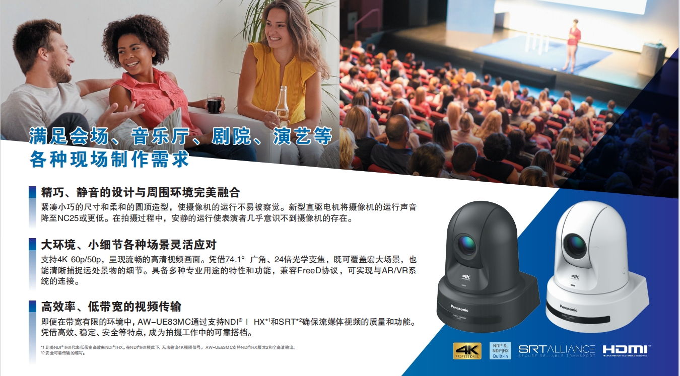 即便在帶寬有限的環境中,AW-UE83W/KMC通過支持NDI? HX2*1和SRT*2確保流媒體視頻的質量和功能。