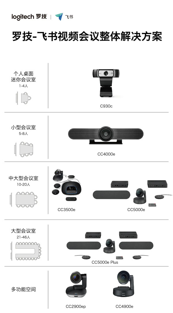 羅技與飛書合作的會議室整體解決方案覆蓋了包括個人桌面、迷你會議室、小型會議室、中大型會議室到多功能空間的多種企業常見協作空間場景,為企業用戶提供了全場景的一站式解決方案選擇。