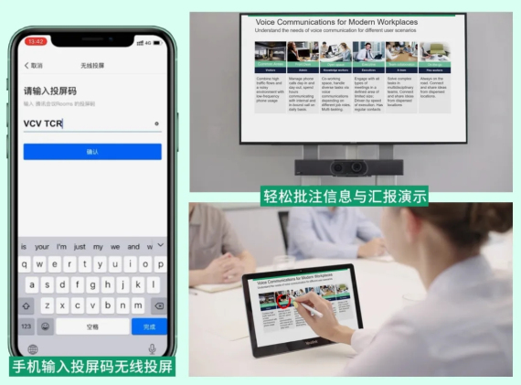 采用騰訊會(huì)議Rooms的投屏碼投屏,可將個(gè)人電腦/手機(jī)等設(shè)備內(nèi)容進(jìn)行無線投屏與批注,讓遠(yuǎn)端位置人員坐享無線輕松協(xié)作。