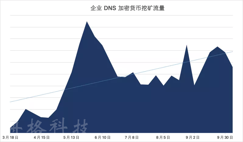 從其發(fā)展歷史來看,加密貨幣市場經(jīng)歷了巨大的波動。根據(jù)我們觀察到的情況,惡意加密貨幣挖礦活動的起落與加密貨幣價值的激增和暴跌是同步的。以思科在 DNS 層上觀察到的加密貨幣挖礦相關(guān)總體流量為例,雖然存在走勢陡峭的波峰和波谷,但整體看來,隨著時間的推移,加密貨幣挖礦活動呈上升趨勢。