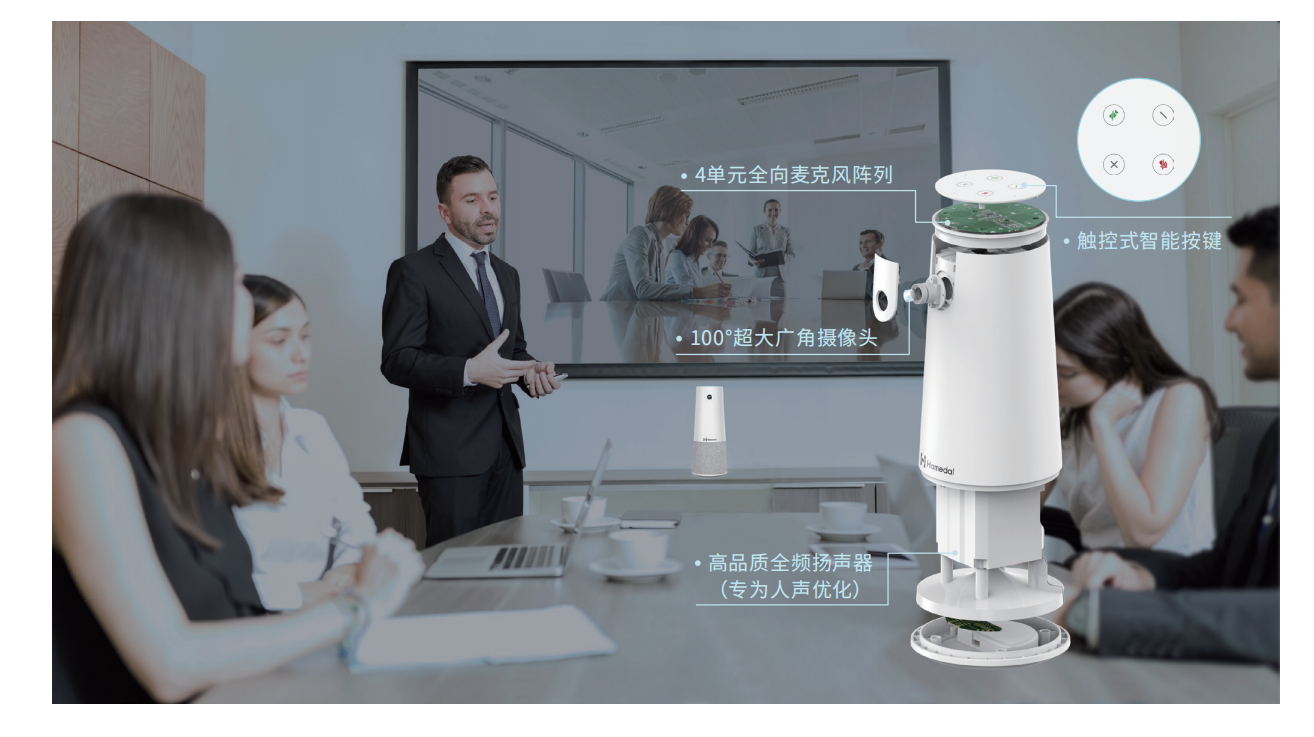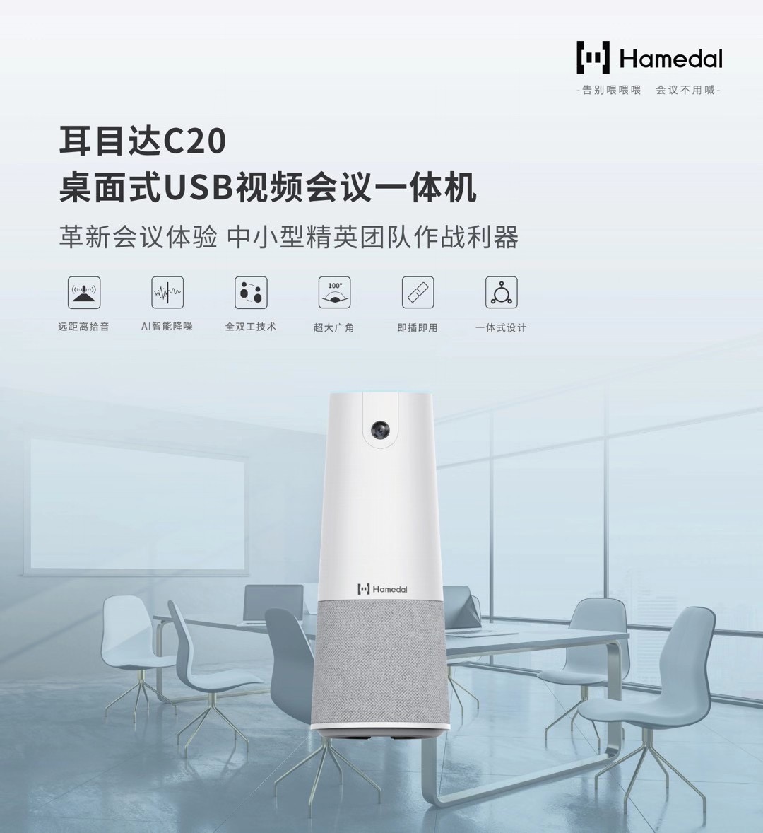 ??Hamedal?C20是蛙聲科技專為中小型精英團(tuán)隊全新打造的一款桌面式USB視頻會議視訊終端,該產(chǎn)品擁有100°超大水平視角,支持1080P全高清視頻通話。內(nèi)置4單元全向麥克風(fēng)陣列以及專為人聲優(yōu)化的高品質(zhì)全頻揚聲器,結(jié)合蛙聲科技第三代Pure?Vioce音頻技術(shù),可實現(xiàn)8米優(yōu)質(zhì)全雙工通話,為用戶提供清晰、穩(wěn)定、流暢的音視頻會議體驗。Hamedal C20集攝像頭、麥克風(fēng)、揚聲器于一體,USB即插即用,兼容多平臺視訊軟件,可完美適用于1-8人會議室,是各類企業(yè)提升遠(yuǎn)程協(xié)作效率的必備利器。