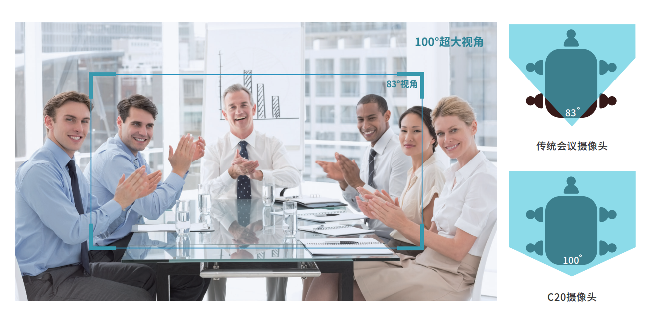 Hamedal?C20采用專業(yè)化定制的100°水平大廣角無畸變鏡頭,使得每個與會人員都清晰可見。開闊的視野能夠真實還原會議場景,配合1080P全高清畫質(zhì)輸出,清晰銳利的圖像顯示讓與會人的表情、動作傳達(dá)更加精細(xì)入微,遠(yuǎn)程會議如同面對面。?